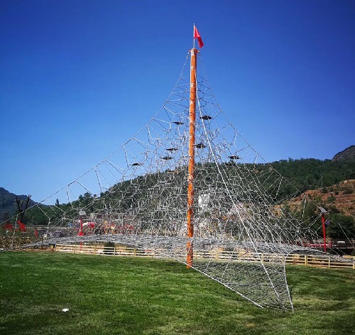 该项目建于2023年5月,为国内最高的金字塔攀爬架游乐设备,其整体高度12米,长宽18米。整个设施耗费钢丝复合绳多达4000米,绳子扣件8000只。使用至今,仍坚实地屹立于业主的游乐场里,不断的吸引着一批又一批的慕名而来的游玩者。